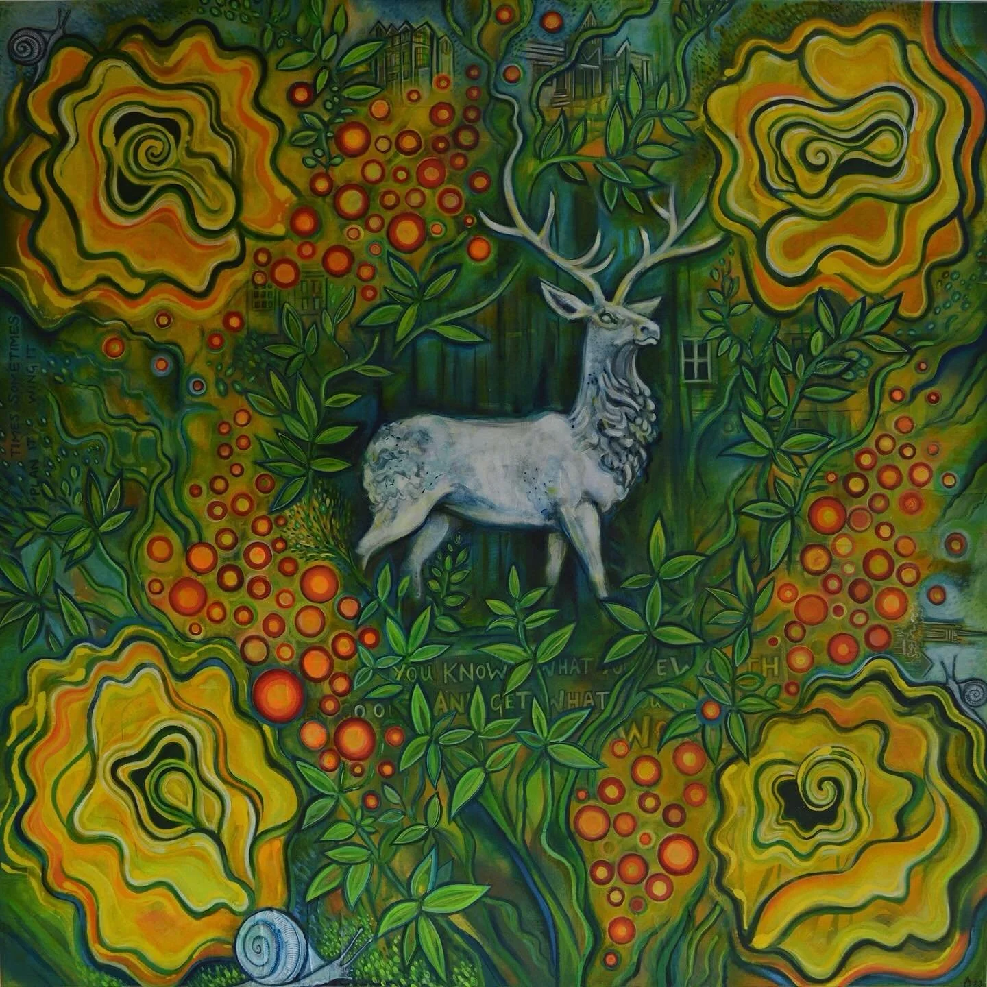 Her paintings feature intense saturated hues. The bold intense colour combinations create a sense of liveliness and humour in her work.